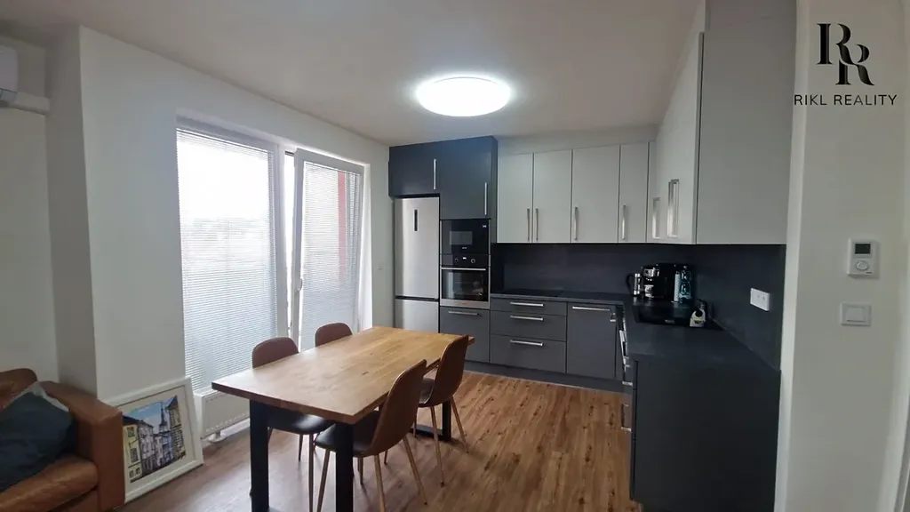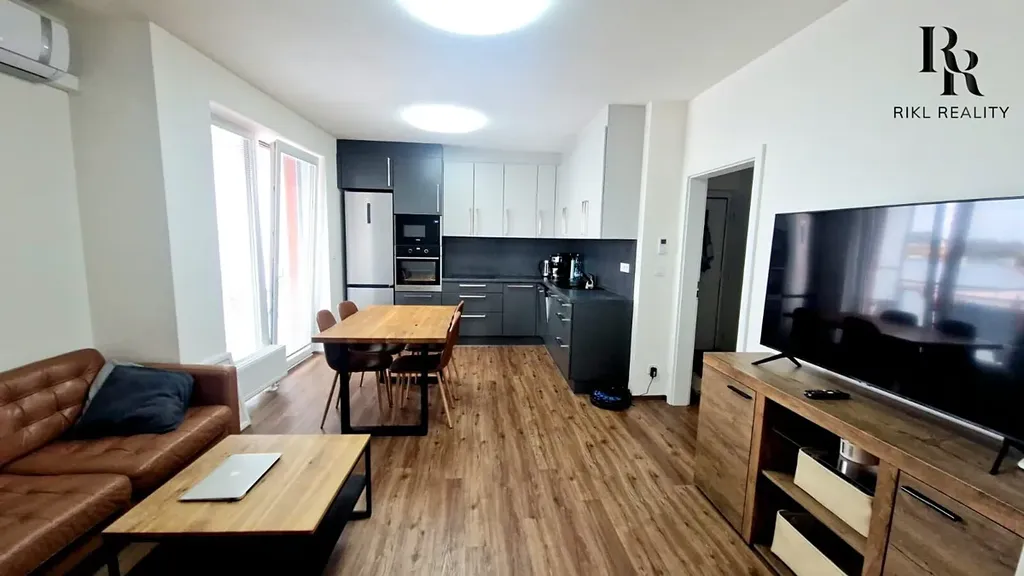 Interiér je řešen moderně a prakticky. Součástí vybavení je kuchyňská linka včetně myčky, klimatizace ovládaná mobilním telefonem, robotický vysavač a inteligentní osvětlení. Díky jihovýchodní orientaci je byt příjemně prosvětlený po celý den.