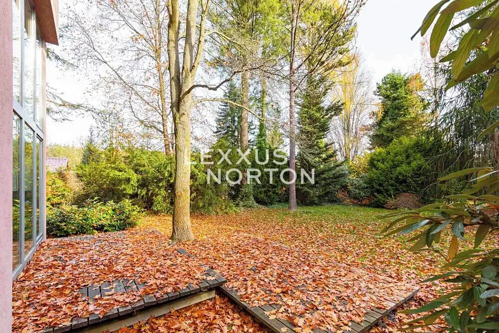 Zahradu lze považovat za zásadní přidanou hodnotou této nemovitosti, jelikož akcentuje sousední les, vzrostlé stromy jsou zde vhodně doplněné okrasnými křovinami a parkovou zelení, zároveň jsou plochy zahrady přesně organizovány. Otevřené travnaté plochy střídají okrasná zákoutí a nabízejí mnohá místa k posezení, to vše stále v poněkud nespoutaném přírodním stylu.