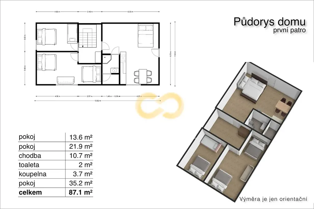 Podkrovní apartmán 1+kk je před dokončením a bude z něj útulné ubytování pro pár nebo menší rodinu. Kuchyňskou linkou a koupelnu si můžete dokončit přesně podle svých představ. Je přístupný po schodišti z přízemí a má také vstup po schodech přes terasu.