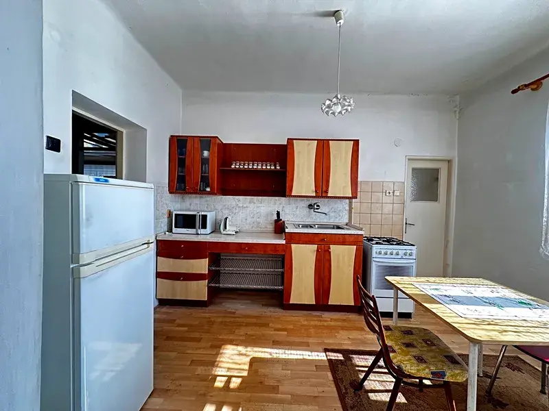 1.NP – veranda, chodba, kuchyně s jídelnou, dva pokoje, koupelna, samostatné WC, komora.