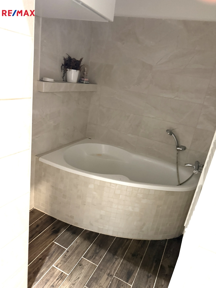 Koupelna se zděným jádrem je navržena s důrazem na komfort a praktičnost – je vybavena rohovou vanou i sprchovým masážním koutem. Samozřejmostí jsou kvalitní materiály a promyšlené řešení prostoru.