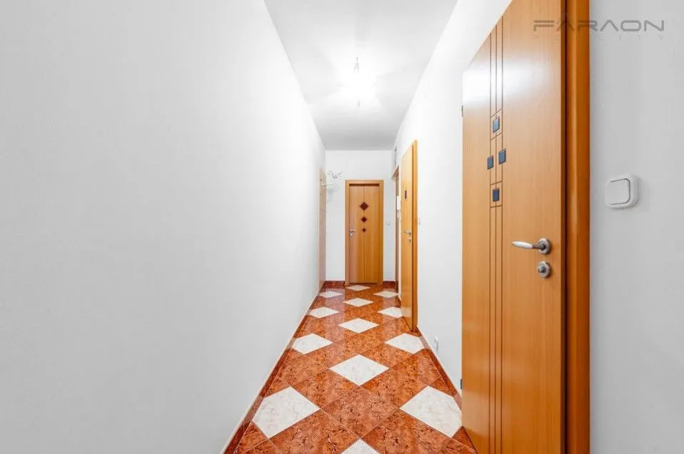 Byt je po nové kompletní rekonstrukci a dispozičně řešen velmi účelně vstupní chodba navazuje na světlý obývací pokoj s plně vybaveným kuchyňským koutem a designovým barovým pultem (vestavěné spotřebiče: myčka, elektrická a mikrovlnná trouba, sklokeramická deska, digestoř, velká lednice s mrazákem). Z pokojů je přímý vstup na terasu s výsuvnou markýzou a krásným výhledem. Samostatná ložnice poskytuje prostor pro dvoulůžko i úložné řešení, další pokoj je vhodný například jako pracovna, šatna nebo dětský pokoj. Prostorná koupelna je vybavena sprchovým koutem, vanou, dvou umyvadlem a místem pro pračku, samostatná toaleta. Další úložné prostory nabízí velké vestavěné skříně a spíž/sklad přímo v bytě.