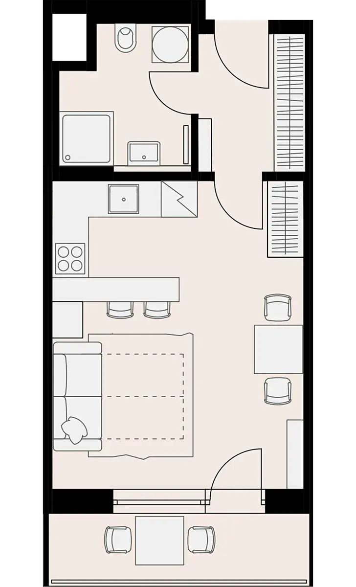 Byt je jednopodlažní a nachází se v šestém patře budovy, nabízí tak klid a útočiště od ruchu města. S užitnou plochou 30 m² poskytuje praktické a pohodlné uspořádání. K bytu navíc patří terasa o ploše 5 m², která je ideálním místem pro relaxaci nebo posezení s přáteli.