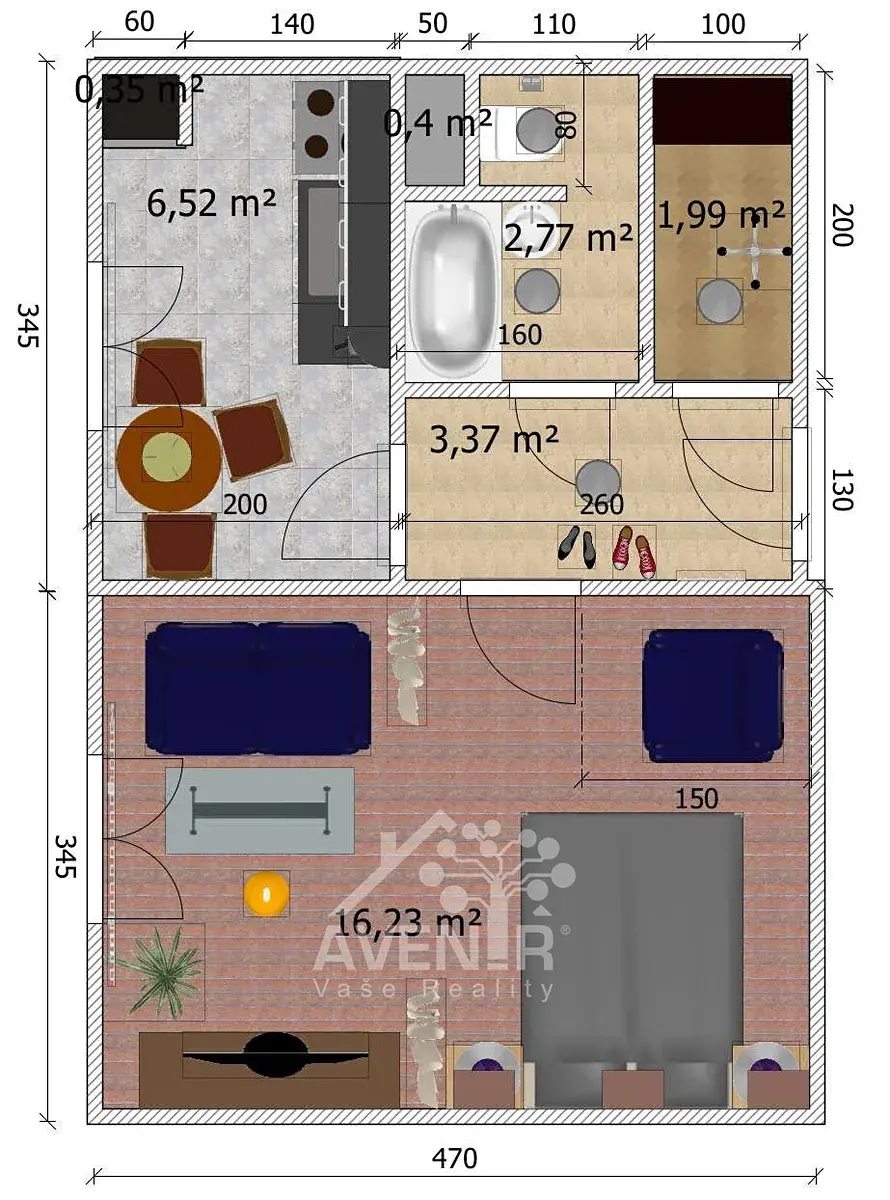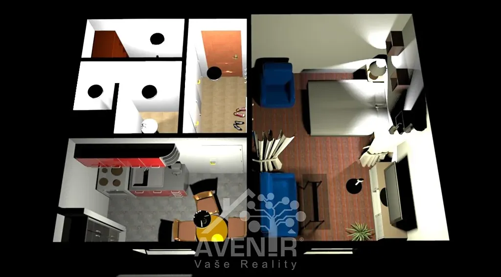 Skládá se z chodby, kuchyně, obývacího pokoje / ložnice, koupelny s wc a komory. Má původní jádro a kuchyňskou linku. Je určen ke kompletní rekonstrukci. Nicméně působí útulně a má do budoucna potenciál. Má plastová okna.