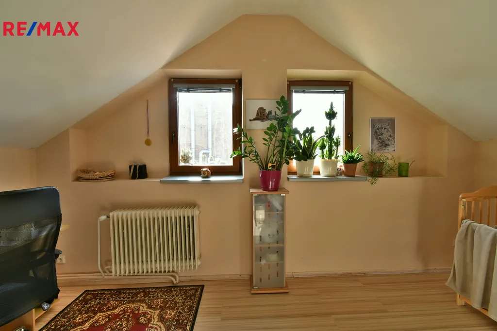 Po otevřeném schodišti se dostaneme do obytného podkroví, kde se nachází: dva samostatné pokoje, koupelna se sprchovým koutem a WC.