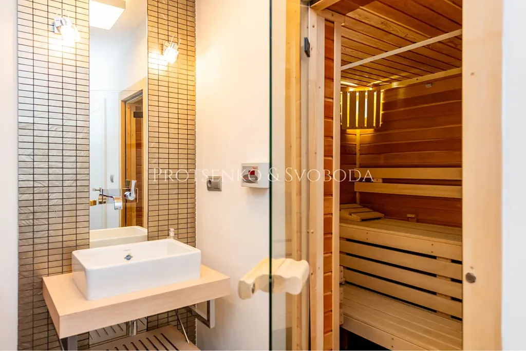 V suterénu se nachází garáž, společenská místnost, sauna, technická místnost a další prostory pro odpočinek a zábavu.