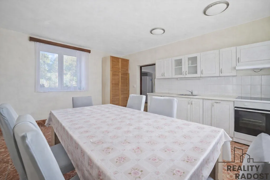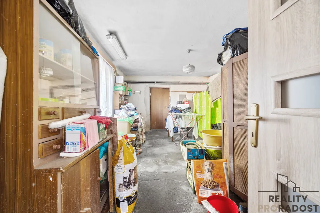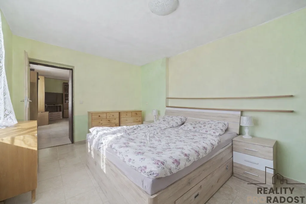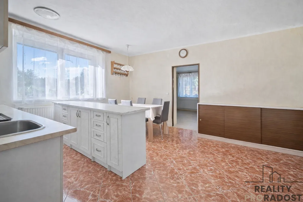 Z předsíně je vstup do kuchyně s jídelnou ze které je vstup do dalšího pokoje dříve dětského pokoje. Zpět přes chodbu je vstup do obývacího pokoje ze kterého je vstup do ložnice. Z předsíně je dále vstup do další místnosti ze které je vstup do dílny.
