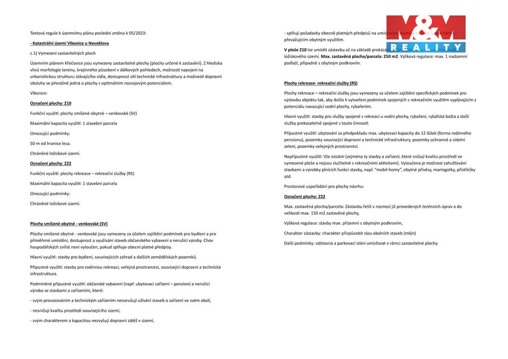 Pozemky jsou v katastru nemovitostí vedeny jako trvalé travní porosty, lesní pozemky a orná půda. Součástí tohoto atraktivního celku jsou také dva stavební pozemky.