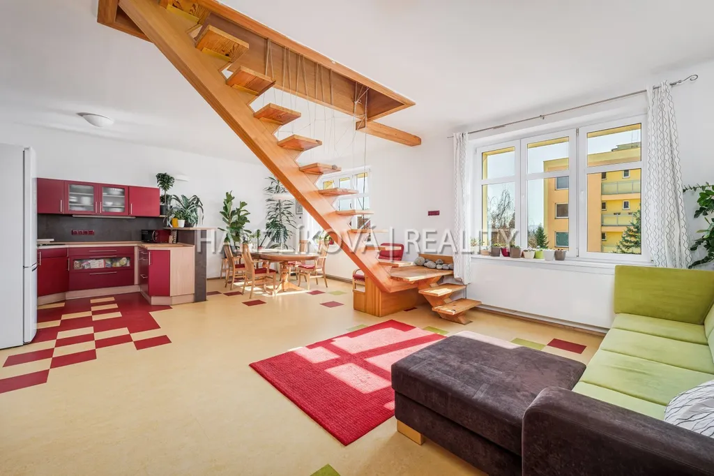 Byt je řešen jako prostorný mezonet, který nabízí příjemné oddělení denní a klidové části.