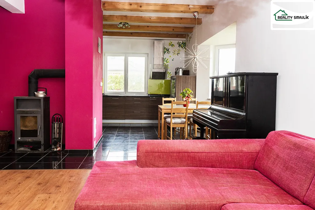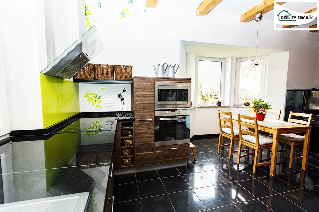 Dominantou domu je světlý obývací pokoj propojený s jídelní částí a kuchyňským koutem, odkud je přímý vstup na terasu – ideální místo pro relaxaci i posezení s rodinou či přáteli. Na hlavní obytný prostor navazuje chodba, ze které je vstup do dvou ložnic, koupelny, samostatného WC, praktické spíže a také do samostatné garsoniéry s vlastní koupelnou a odděleným vstupem, což nabízí skvělou příležitost pro vícegenerační bydlení, hosty či pronájem.