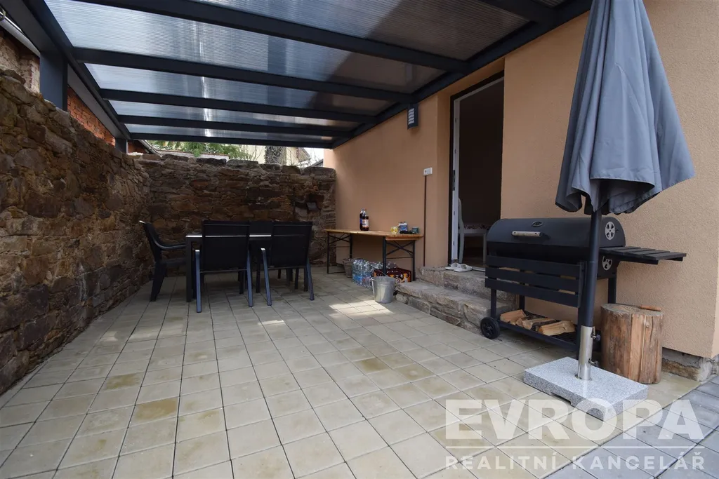 Rekonstrukcí prošlo i okolí domu, předzahrádka a vlastní dvorek, který je zpevněný zámkovou dlažbou a umožňuje tak parkování na vlastním pozemku pro dvě auta. V roce 2025 bylo provedeno nové oplocení, postaven malý zahradní domek a vybudována velká hliníková pergola se střešní krytinou z polykarbonátu. Prostorná pergola nabízí v letních měsících příjemné venkovní posezení a v zimních měsících se tento prostor dá využít jako přístřešek pro osobní auto.