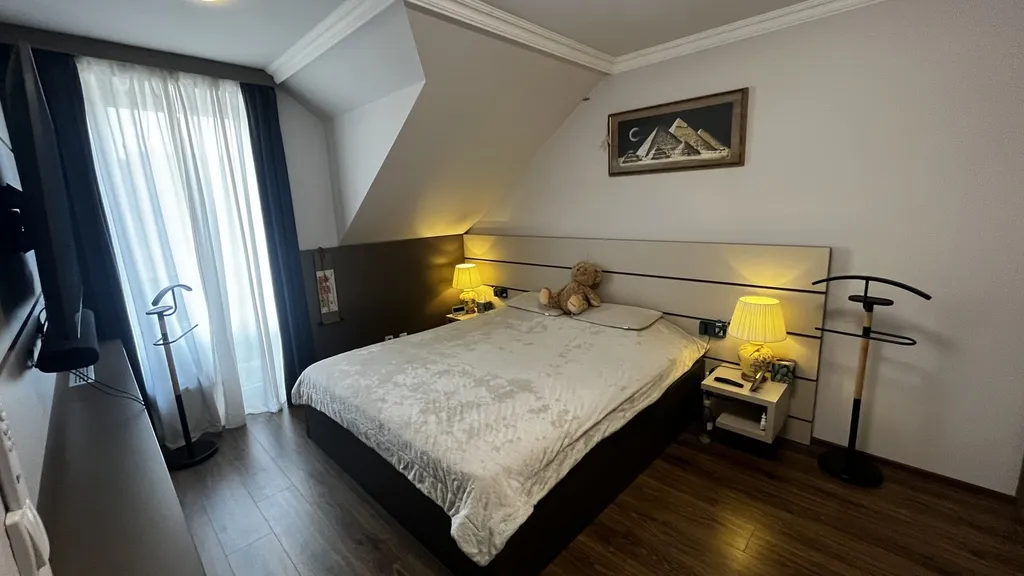 Celý interiér je laděn v moderním a velmi vkusném stylu. Dřevěné obklady stěn, designové tapety a nábytek vyrobený na míru vytvářejí harmonické a útulné prostředí, kde se každý okamžitě cítí jako doma.