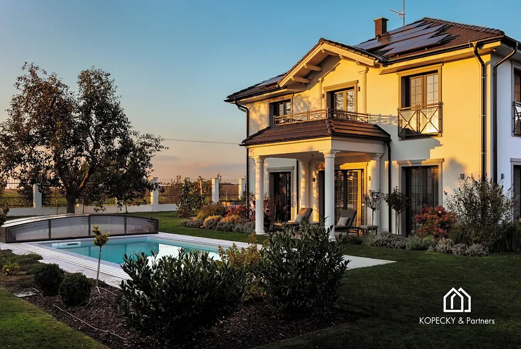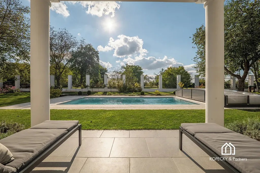 Na profesionálně udržované zahradě najdete zastřešený bazén 8×4 m se slanou vodou, zavlažovací systém, vrtanou studnu a zahradní domek. Parkování je zajištěno v dvojgaráži a na dalších plochách až pro 7 automobilů, včetně přípravy na dobíjení elektromobilů.