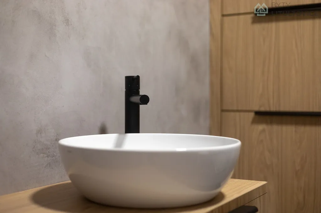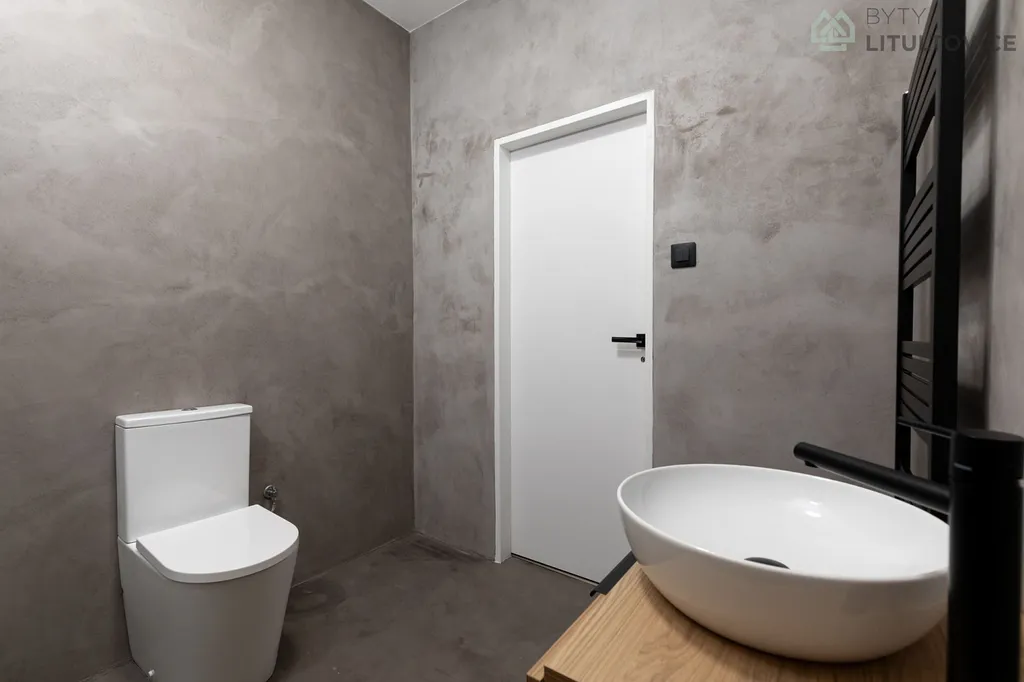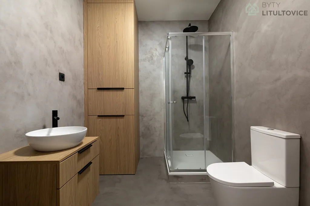 Prostorná koupelna působí moderním dojmem díky nové betonové stěrce. Je vybavena sprchovým koutem a nábytkem na míru, který umožňuje pohodlnou a přehlednou organizaci věcí.