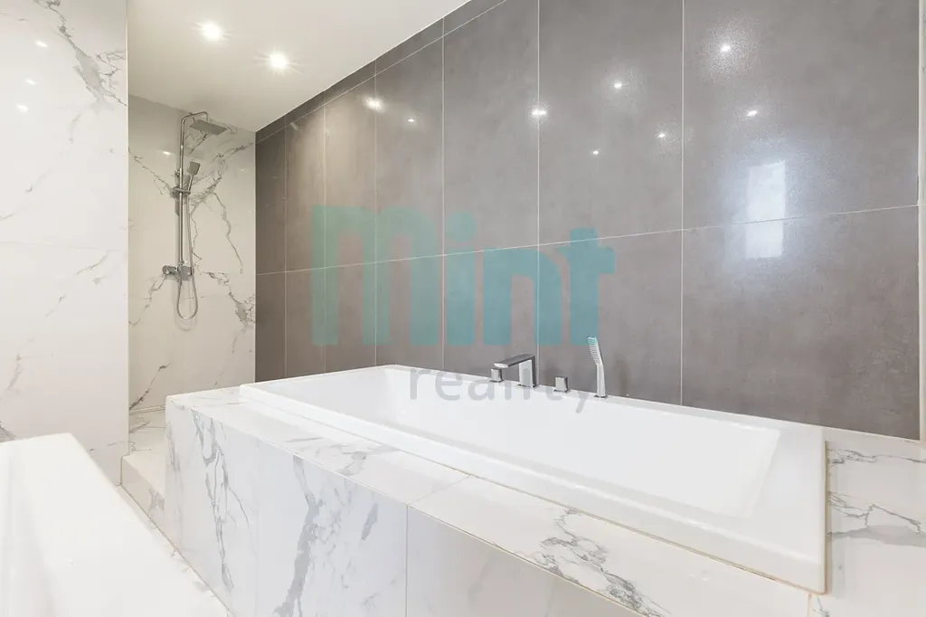 Koupelna, zařízená v elegantní barevné bílého mramoru, nabízí vanu, umyvadlo a moderní umyvadlovou skříňku. Toaleta a závěsný bidet jsou součástí koupelny.
