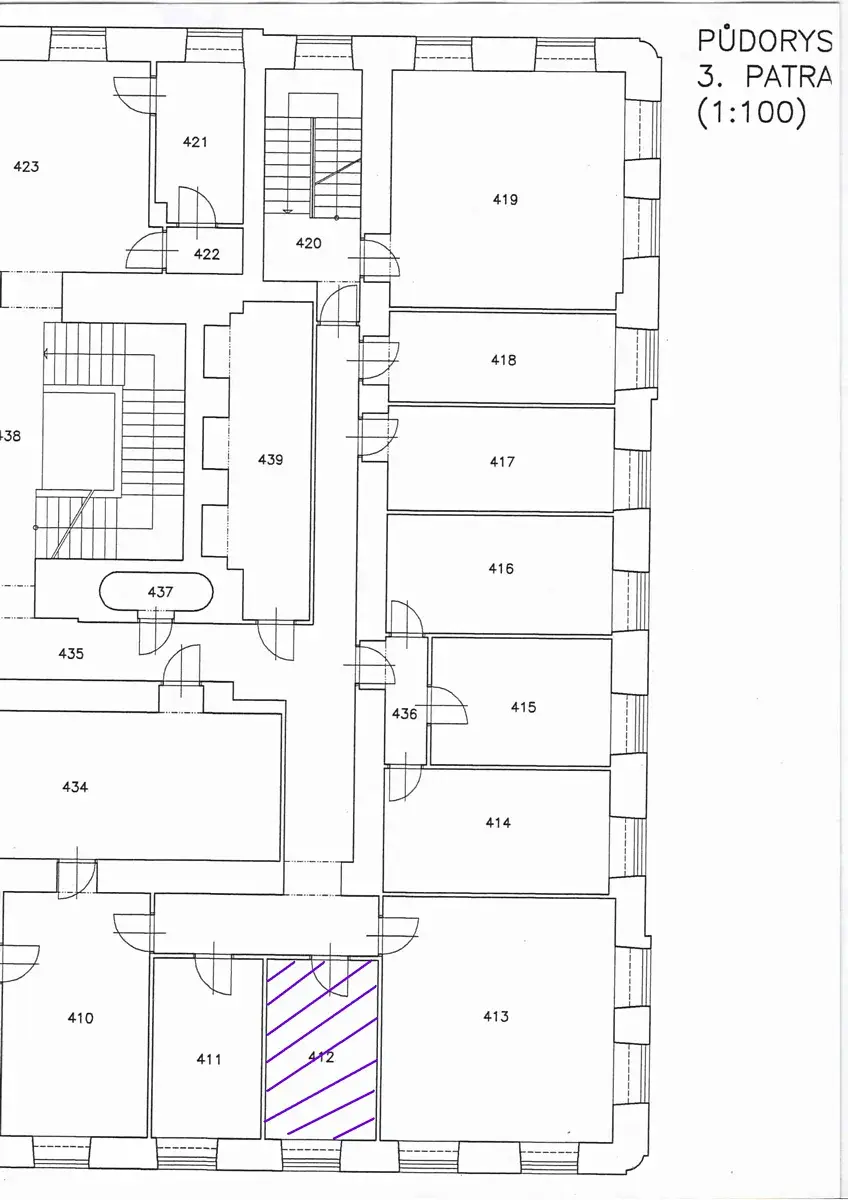 Prostor tvoří jedna menší kancelář. Kancelář je vymalovaná na bílo, na podlaze je položen koberec. Kancelář je směřována na východ do ulice Benešova.