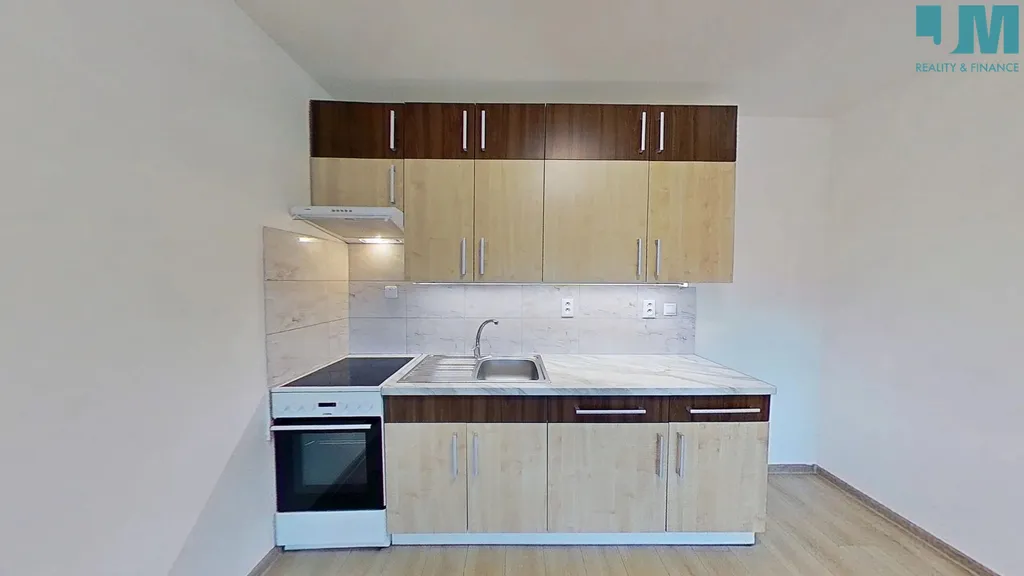 Byt nabízí prostorný a velmi světlý obývací pokoj s kuchyňským koutem, který díky velkým oknům poskytuje krásný výhled do okolní přírody a dostatek denního světla po celý den. Kuchyňská linka je vybavena varnou deskou, troubou, digestoří a dřezem.