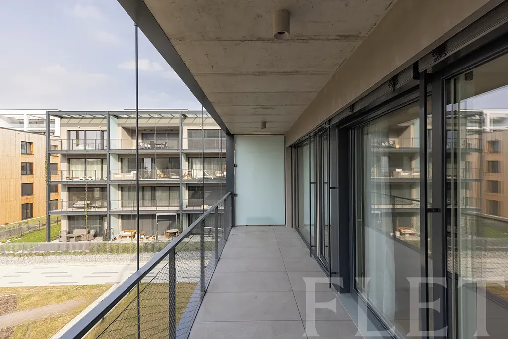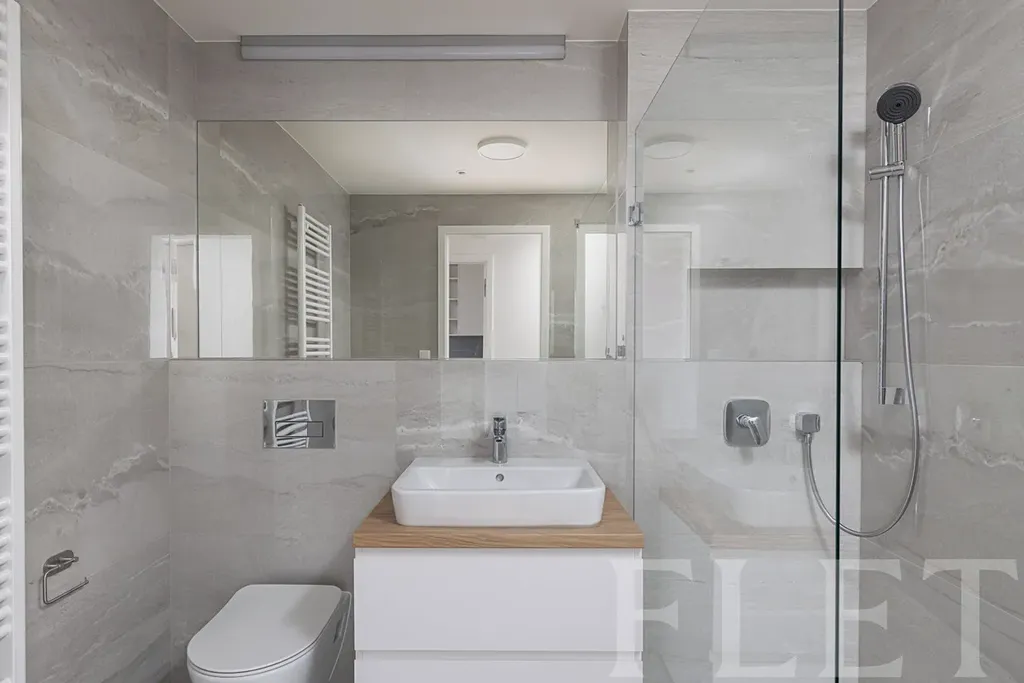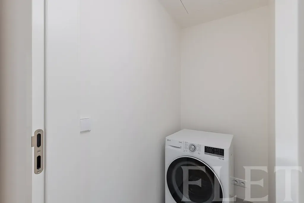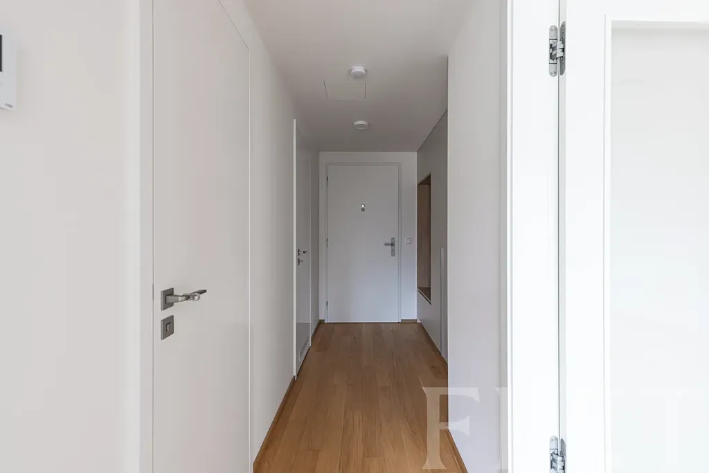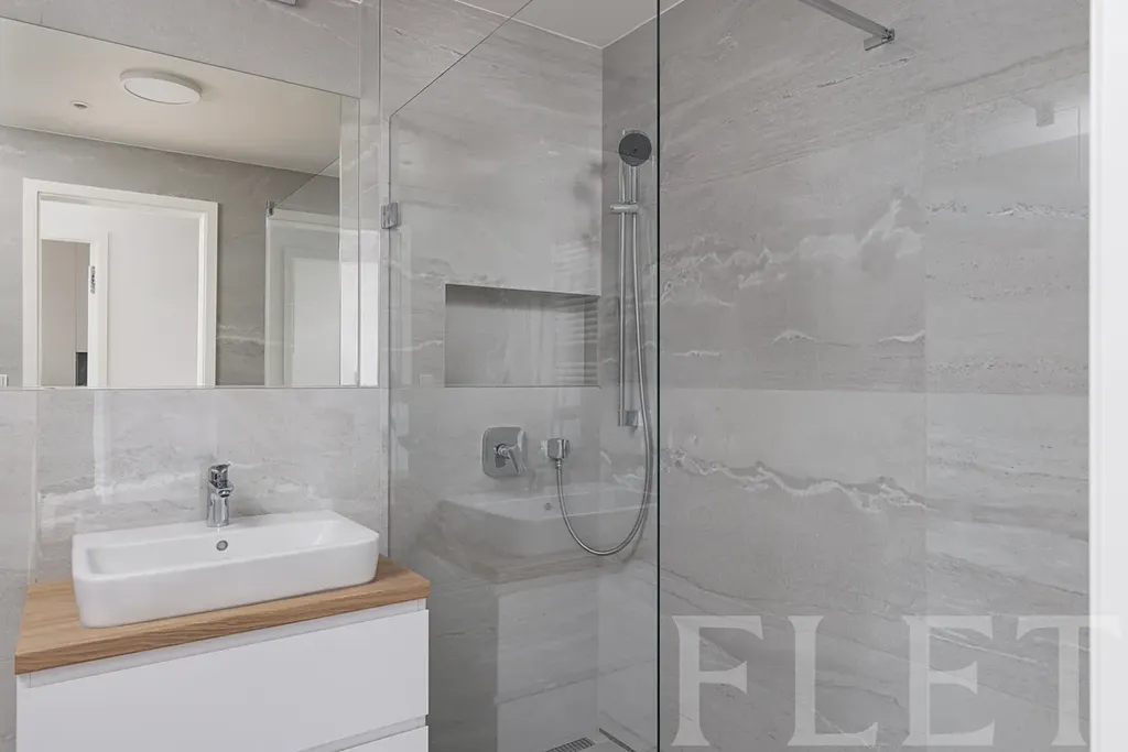 Dominantou bytu je vzdušný obývací pokoj s kuchyňským koutem a vstupem na terasu, která je přístupná také z ložnice. Díky tomu nabízí příjemné propojení interiéru s venkovním prostorem a klidné místo pro ranní kávu či večerní relax. Elegantní kuchyňská linka nabízí velké množství úložného prostoru a je plně vybavena moderními spotřebiči. V chodbě se nachází praktická a designově řešená vestavěná skříň. Byt dále disponuje samostatnou technickou místností s pračkou, která zajišťuje další úložný prostor a komfort v každodenním provozu. Koupelna je provedena v moderním stylu a podtrhuje celkový nadčasový charakter bytu.
