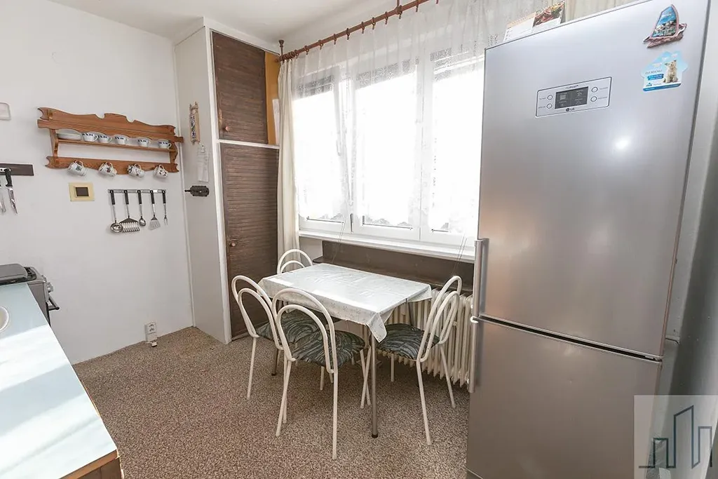 Po vstupu do bytu se ocitnete v prostorné chodbě, jejíž součástí je praktická šatna vhodná jako úložný prostor. Přímo naproti vstupu se nachází prostorná ložnice. Chodba dále pokračuje doprava, kde je umístěna samostatná toaleta a koupelna. Po levé straně se nachází kuchyně s kuchyňskou linkou a jídelním stolem. Součástí kuchyně je také praktická skříň sloužící jako špajz. Z kuchyně je vstup do prostorného obývacího pokoje. K bytu náleží sklepní kóje.