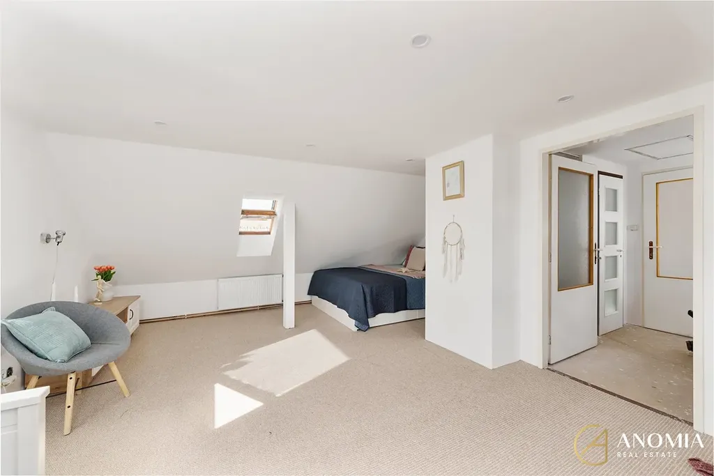 V patře se v pravé části nachází prostorný pokoj, který lze jednoduchou úpravou rozdělit na dva samostatné neprůchozí pokoje. Připravené rozvody v levé části patra zde zároveň umožňují vybudování druhé koupelny nebo kuchyně.