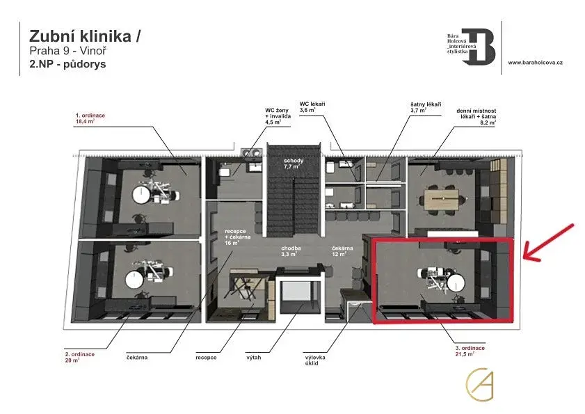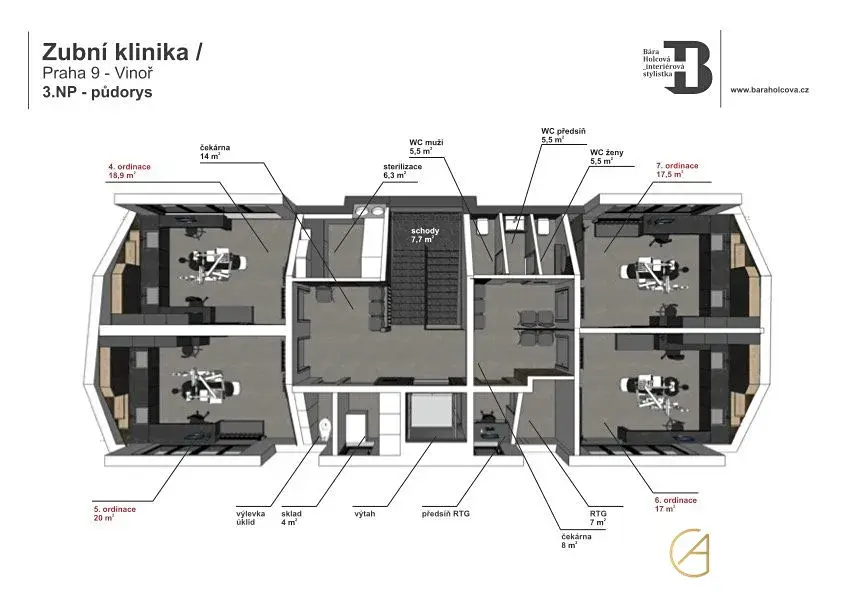 Nabízíme k pronájmu zcela novou, moderně navrženou ordinaci o výměře 21,5 m2 s možností využívání společných částí o výměře přes 75 m2, která je součástí nově budovaného zdravotnického zařízení ve vyhledávané lokalitě Praha–Vinoř. Prostor je ideální například pro provoz zubní, ortodontické či estetické praxe. (další využití je možné dle individuální domluvy).