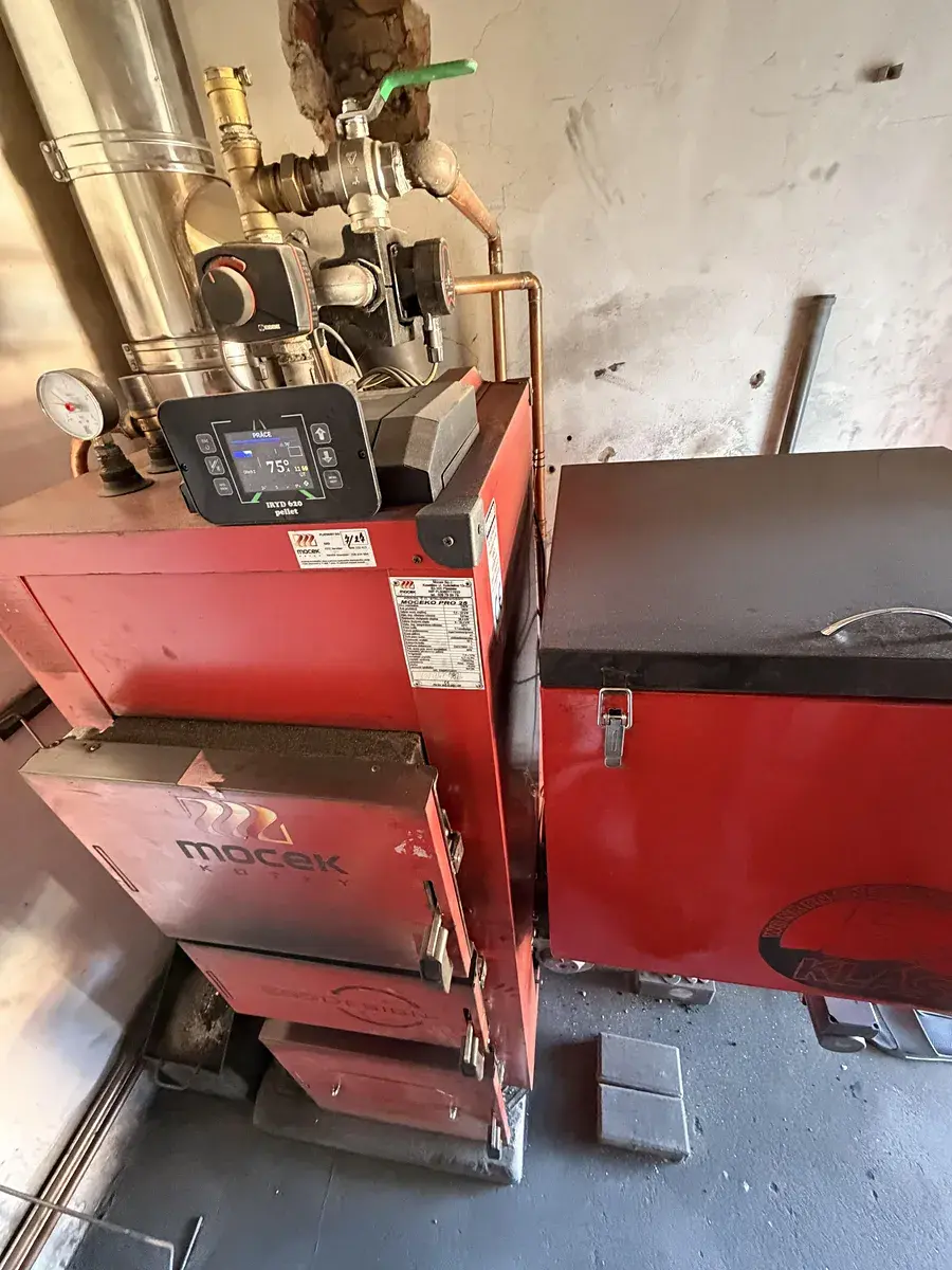 Celý dům je vytápěný kotlem na tuhá paliva (ořech "2" Ledvice), polský kotel Mocek, 5. emisní třída (revize do 07/27), automatické dávkování s natápěním TUV. V záloze je ještě elektrický kotel (funkční, ale 2 roky se nepoužívá a nemá revizi) a otevřený krb v obývacím pokoji. Ohřev TUV v létě elektrickým bojlerem.