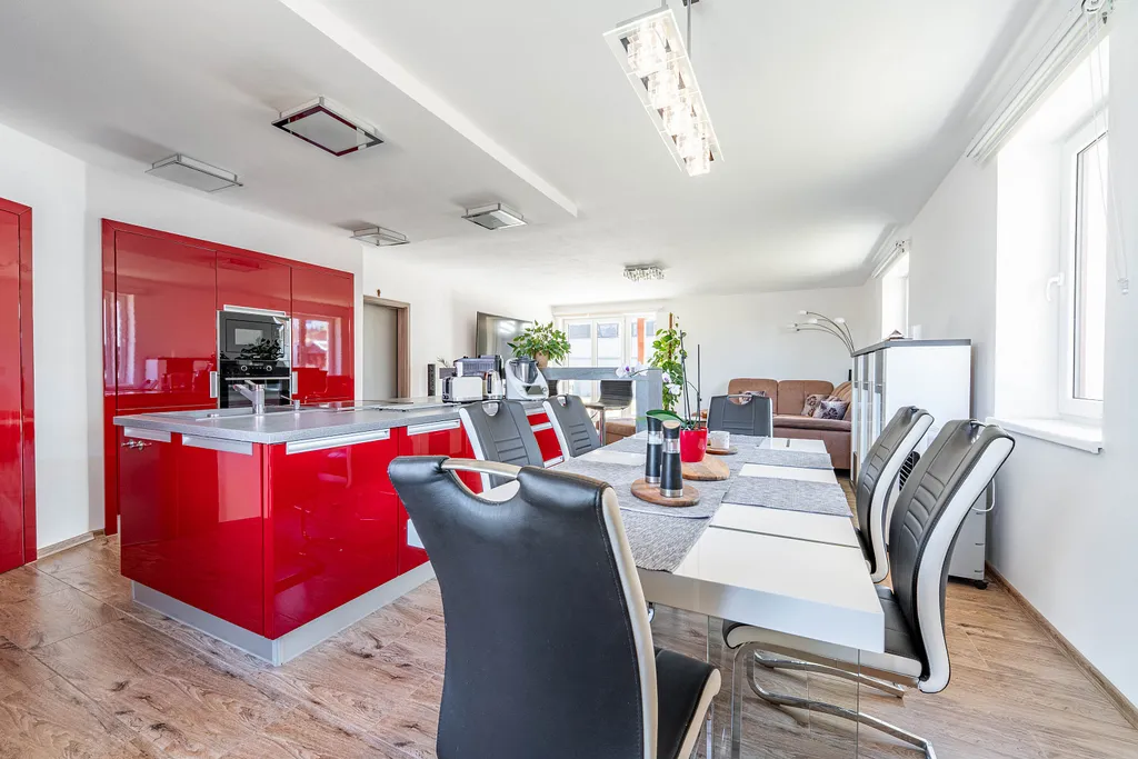 Dominantou domu je velkorysý obývací prostor s kuchyní na míru, kuchyňským ostrůvkem a jídelní částí, odkud je přímý vstup na terasu. Ta se stává přirozeným pokračováním obytného prostoru a nabízí ideální místo pro rodinné chvíle, grilování nebo večerní relaxaci ve vířivce pod pergolou.