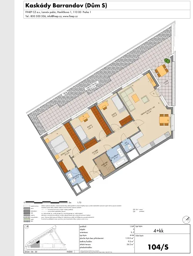 Nabízíme k prodeji byt o dispozici 4+kk v osobním vlastnictví vlastnictví v developerském projektu od Kaskády Barrandov od společnosti Finep. Užitná plocha bytu je 110 m2 + lodžie 9,2m2 a rozlehlá terasa 56,2m2. Byt se nachází ve 1 patře domu S a má orientaci na západ a sever. K bytu je možné za příplatek dokoupit 2x garážové stání a prostornou komoru 6,8 m2 Byt bude dokončen v druhé polovině roku 2027. Na byt bude poskytnuta záruka 3 roky. Klientské změny jsou stále možné. Skvělá investiční příležitost. Prodej probíhá formou postoupení smlouvy o budoucí smlouvě kupní u developera. Nyní hradíte pouze poplatek za postoupení smlouvy ve výši 4 640 742,- Kč. Doplatek kupní ceny se hradí po kolaudaci v roce 2027 na účet developera