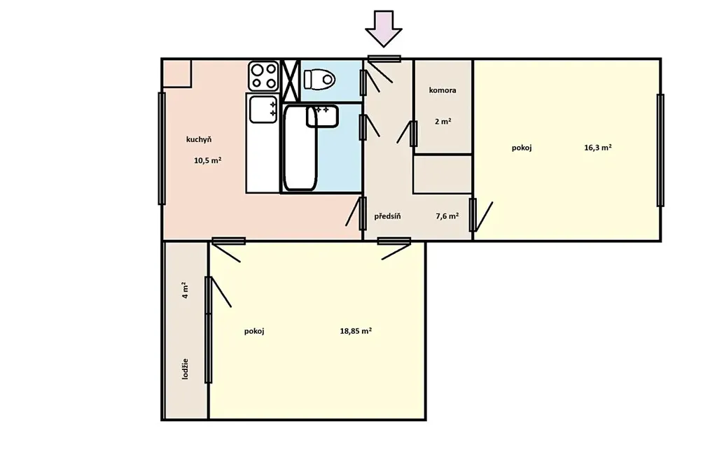 Dispozice bytu nabízí samostatnou kuchyň s jídelním koutem, prostorný obývací pokoj i ložnici a praktickou komoru, která je vždy po ruce. Bytové jádro je původní, vhodné k modernizaci. Příjemným benefitem je zasklená lodžie orientovaná na západ, ideální pro odpočinek v odpoledních a podvečerních hodinách.