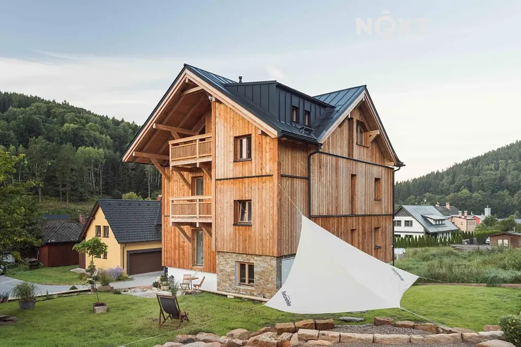 Velkorysé prosklené plochy propojují interiér s okolní přírodou a z každého patra se otevírají úchvatné výhledy na horskou krajinu.