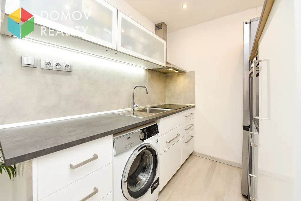 - Moderní kuchyňský kout vybavený sklokeramickou varnou deskou, digestoří, vestavěnou troubou, lednicí s mrazákem, pračkou a jídelním stolem se židlemi