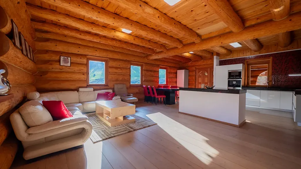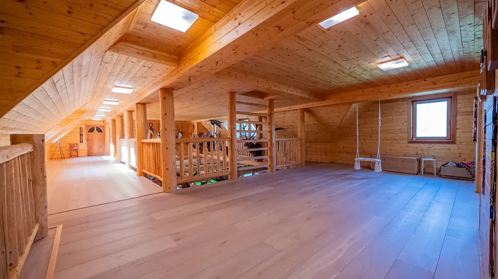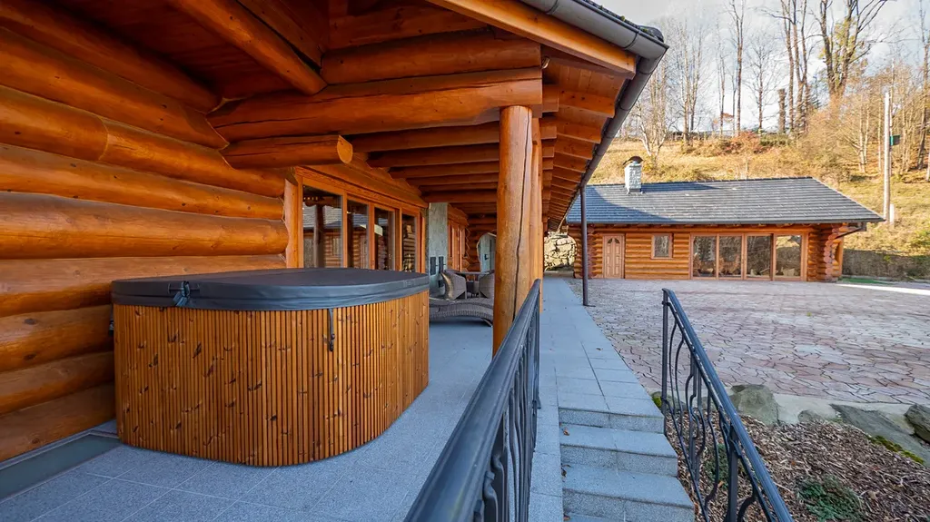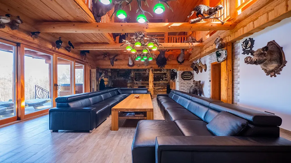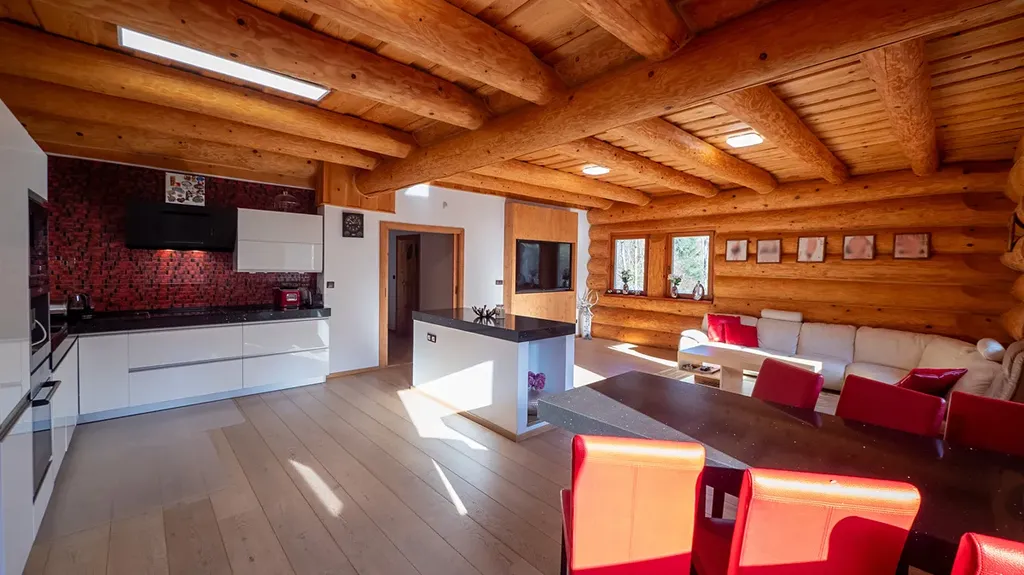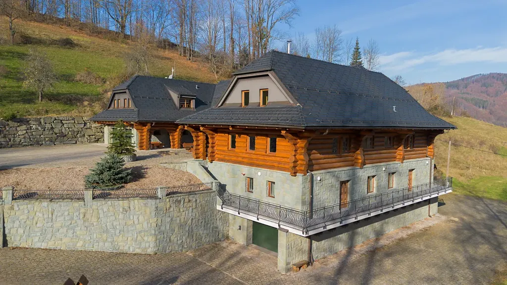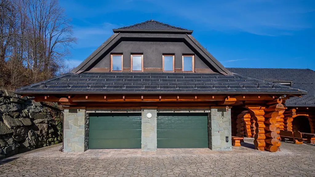 Tato unikátní stavba, kombinující srubovou a zděnou architekturu, nabízí dvě nadzemní podlaží a dvě suterénní úrovně. V hlavních podlažích se nachází obytné prostory a garáž. První suterén je ideální pro relaxaci, zábavu nebo jako kancelářské zázemí. Druhý suterén slouží pro technickým zařízení, skladovací prostory a nabízí další garáží.
