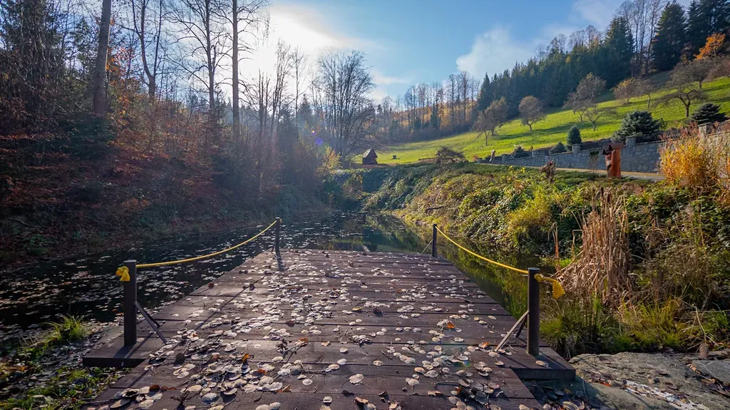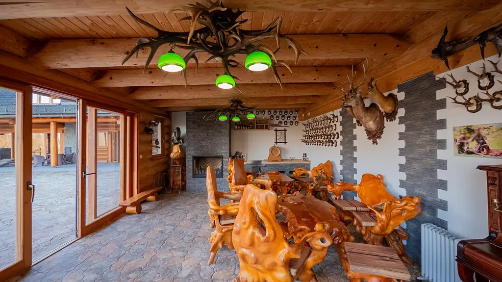 Součástí usedlosti je menší samostatný srub, který slouží jako společenská nebo relaxační místnost. Tento srub je vybaven luxusním dřevěným nábytkem, kuchyňskou zónou, krbem a udírnou. K dispozici je také další samostatná garáž s krytým stáním. Celková plocha pozemků, která zahrnuje louky a lesy, činí 38 944 m².