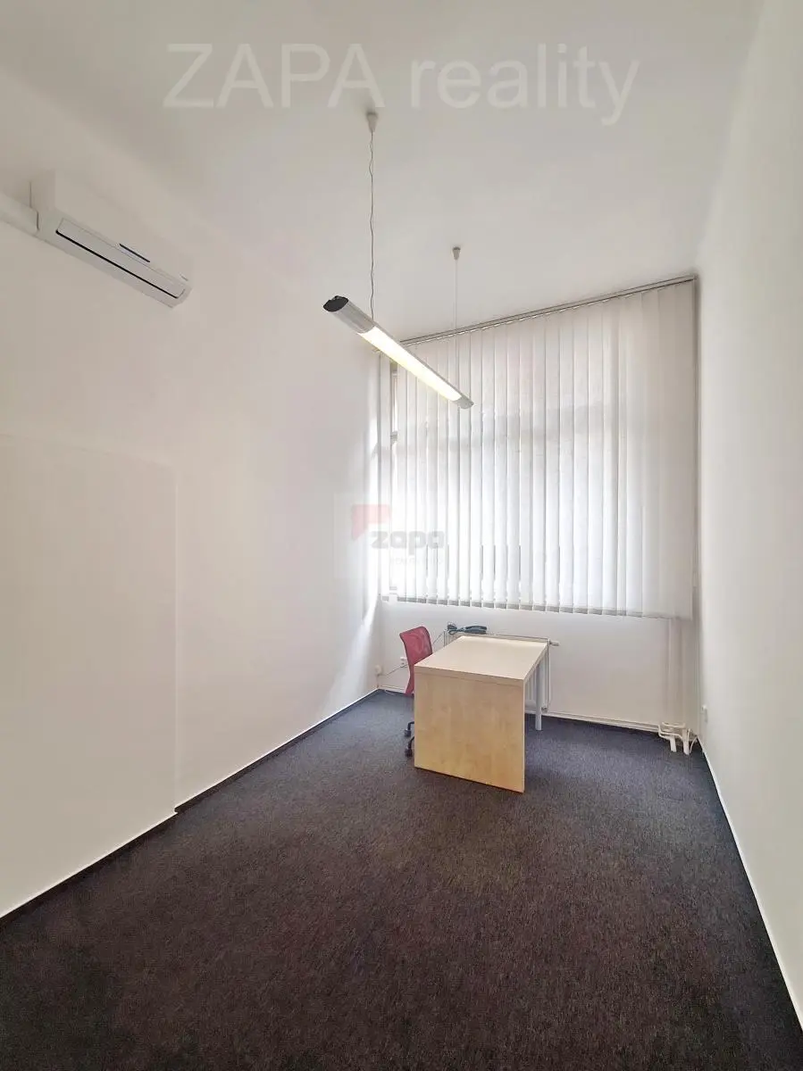 Kancelář je po rekonstrukci (vymalovaná, nové žaluzie, nový koberec) a je nezařízená s vysokými stropy 3,7 m, výhled z oken je do klidného tichého vnitrobloku.
