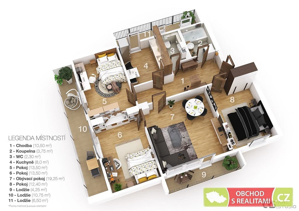 Byt se nachází v nejvyšším 2. patře, jedná se o nástavbu dřevěné konstrukce na původním cihlovém domě. Z obývacího pokoje je přístupná první lodžie (orientace na jih s výhledem do vnitrobloku), největší druhá lodžie je přístupná ze dvou ložnic bytu (západní orientace s výhledem směr Obchodní centrum Delta), z kuchyně je přístupná třetí lodžie (severní orientace a výhled do ulice).