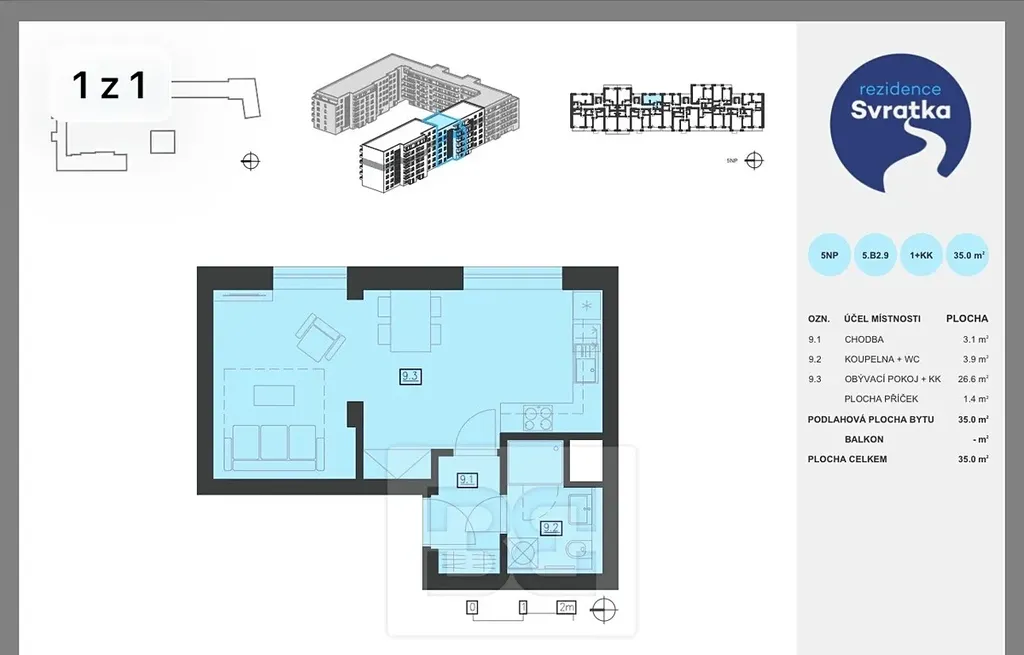 Dispozice bytu nabízí předsíň, moderní koupelnu se sprchovým koutem, umyvadlem a toaletou, dále obývací pokoj s kuchyňským koutem a samostatnou ložnici.