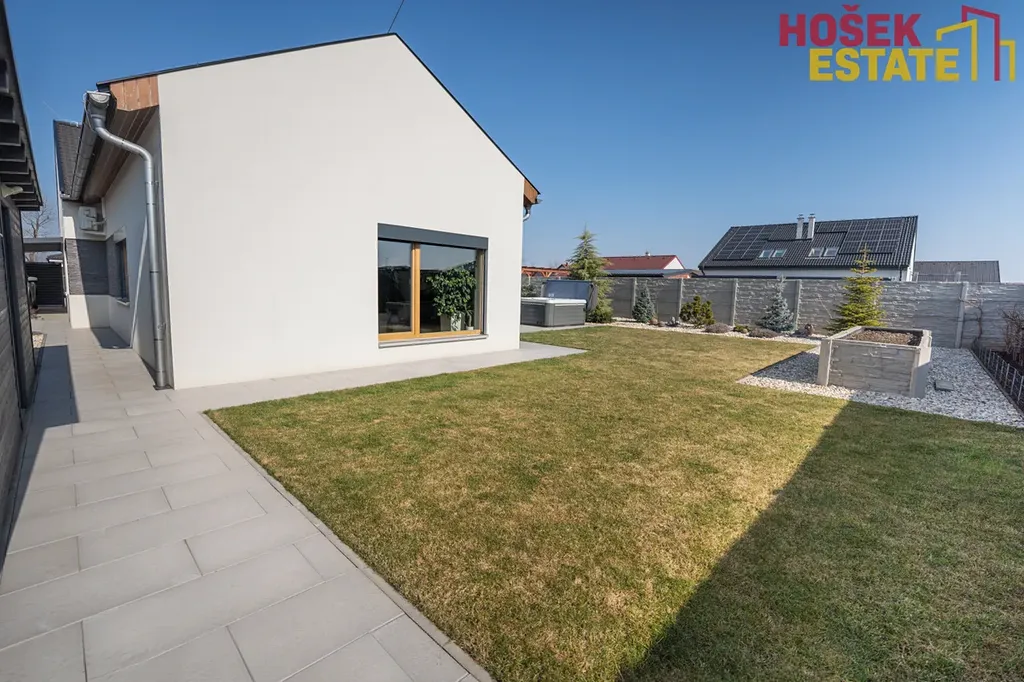 Velkou výhodou je také prostorná zahrada o velikosti přibližně 536 m², která poskytuje dostatek místa pro relaxaci, rodinné aktivity. Zahrada je vybavená bioklimatickou pergolou, prostornou terasou na které může stát vířivka.