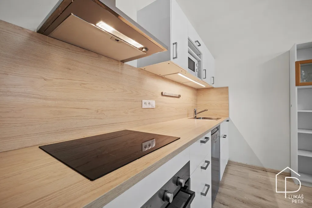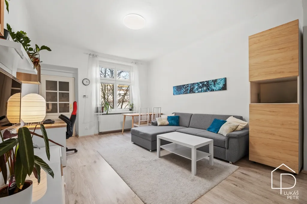 Dispozice je praktická a přehledná – obývací pokoj s kuchyní, samostatná ložnice, koupelna s vanou a samostatné WC. Byt má zděné jádro, plastová okna a laminátové podlahy. Příjemným detailem je také větrací okénko v koupelně i na WC.
