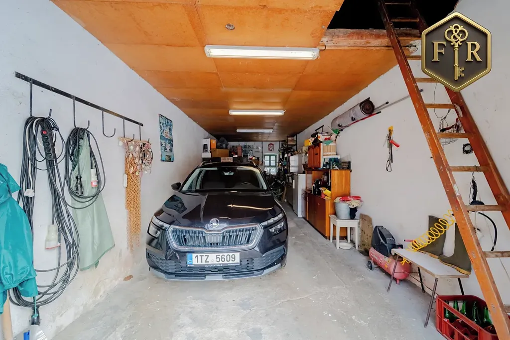 Vedle hospodářské budovy je také garáž s dílnou a prostor pro uskladnění zahradního vybavení.