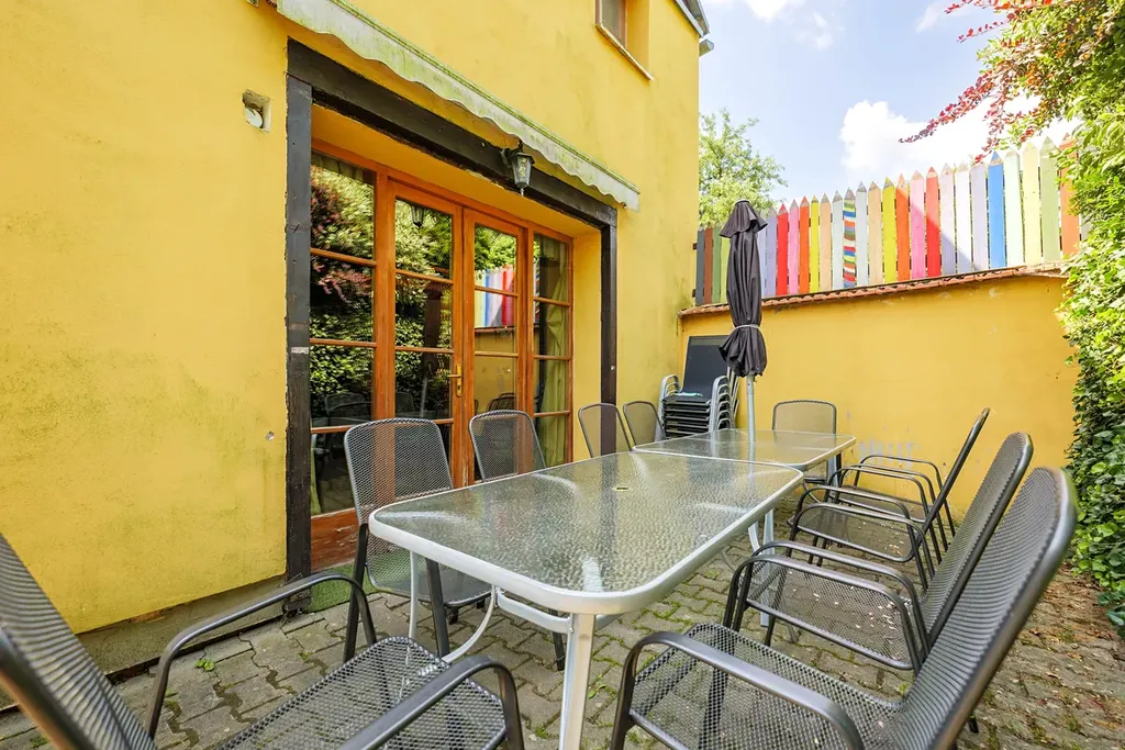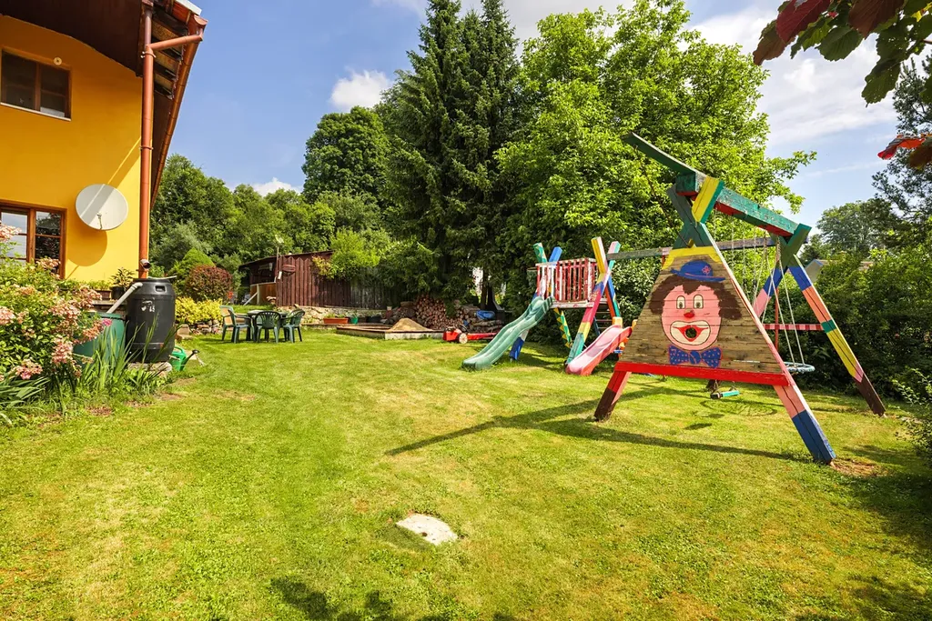 Dům stojí na samostatném pozemku o velikosti 1064 m², což zaručuje dostatek soukromí a prostoru. Na pozemku je umístěno dětské hřiště, terasa, záhony, pozemek je lehce svažitý a skloněný k jihu. Příjemné chvíle můžete trávit na zahradě s bazénem, který je ideálním místem k relaxaci je zde také dřevník a pergola. K dispozici jsou také dva sklepy o ploše cca. 35 m² a dílna který nabízí dostatečný úložný prostor. Parkování může být i přímo na pozemku.