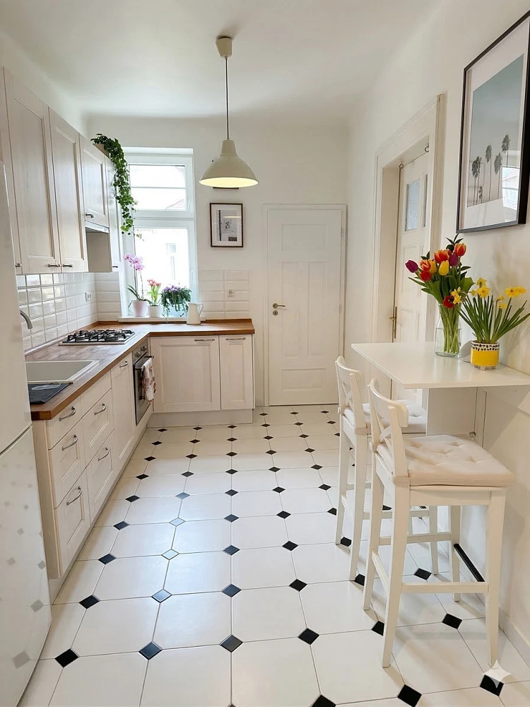 Byt je po kompletní rekonstrukci a spojuje klasické prvky vinohradské zástavby s moderním designem — vysoké stropy, tradiční dřevěná podlaha a okna na dvě světové strany s výhledem do klidného vnitrobloku a na západ slunce směrem k Vinohradům.