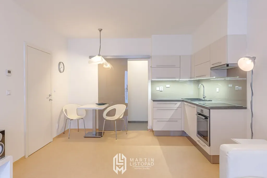 Byt se nachází ve 2. nadzemním podlaží a je ve velmi dobrém stavu. Díky velkým oknům je byt světlý a vzdušný. Dispozice bytu zahrnuje prostornou vstupní chodbu se šatníkem, koupelnu se sprchovým koutem, samostatné WC, ložnici s přímým vstupem na balkon a obývací pokoj propojený s kuchyňským a jídelním koutem. Kuchyňská linka je plně vybavena spotřebiči. K bytu dále náleží komora, ve které je umístěna lednice a pračka. Volně stojící nábytek je možno na základě dohody odkoupit.