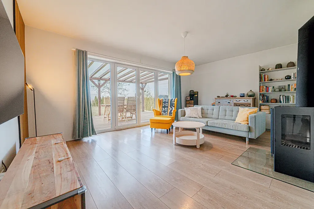 V 1. NP [74 m²] nalezneme obývací prostor s kuchyňským koutem a přímý vstup na terasu, ideální pro relaxaci a odpočinek. Dále se v této části nachází koupelna se sprchovým koutem a toaletou.