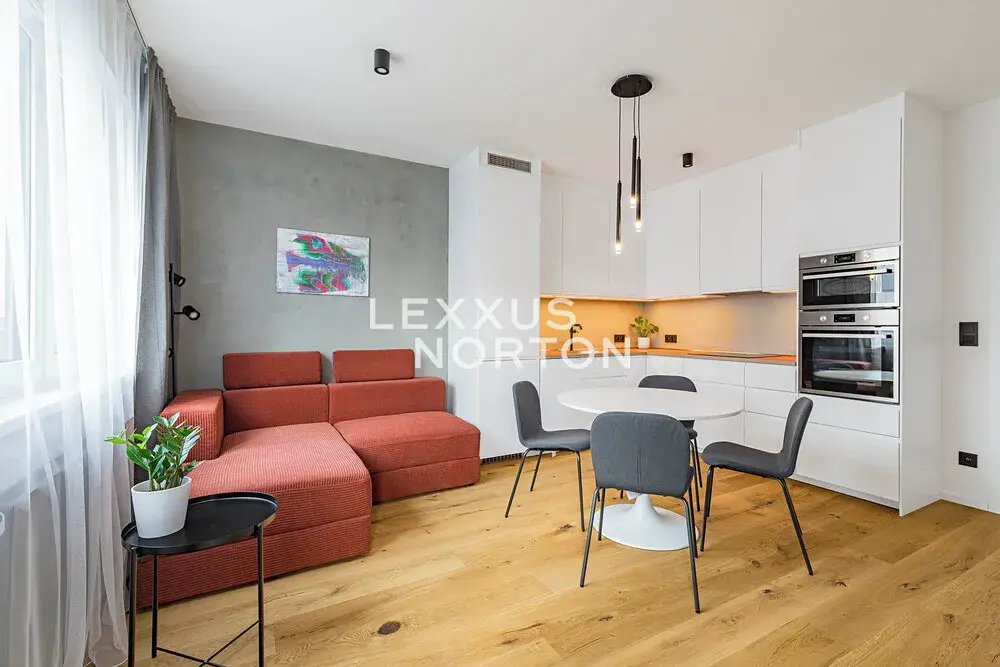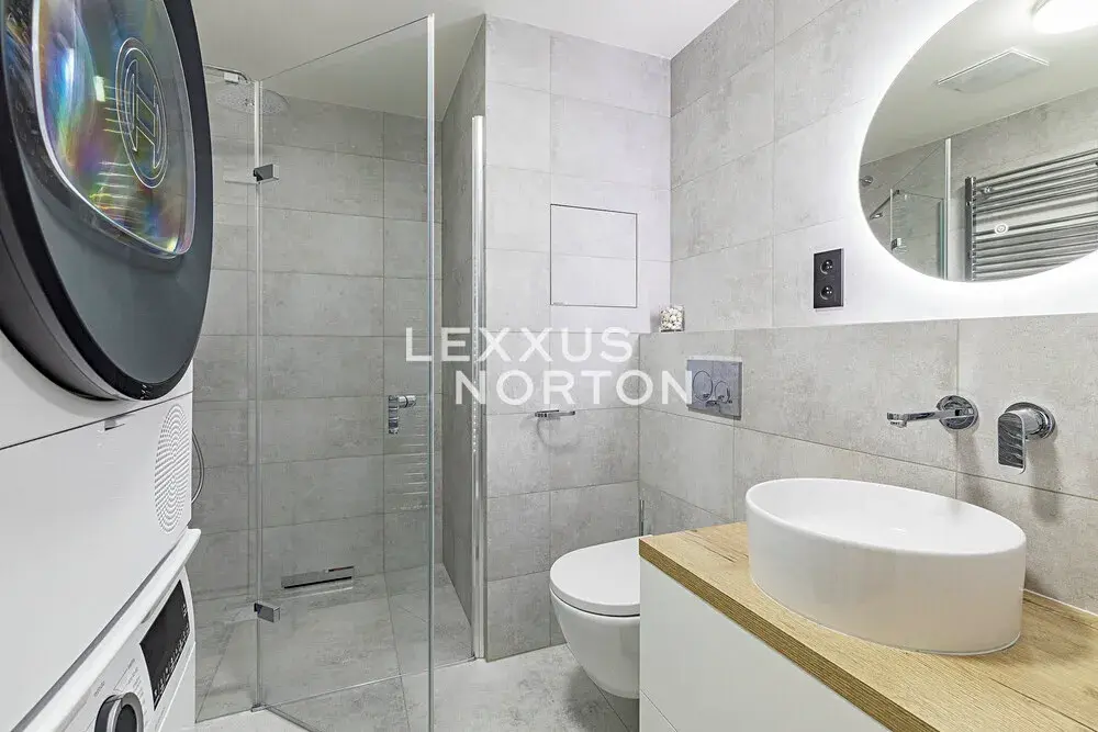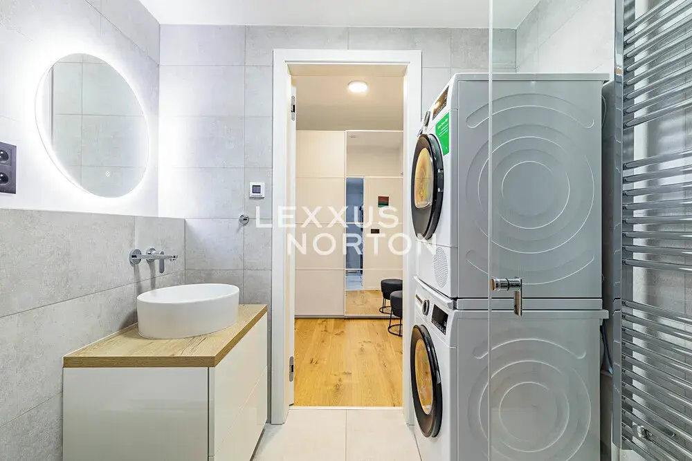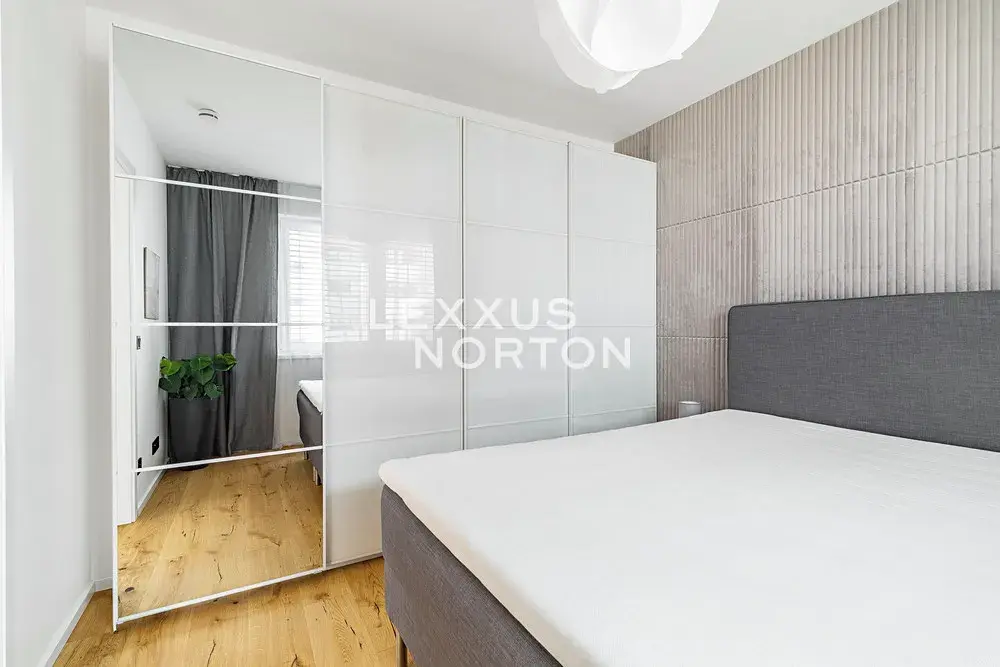 Byt je kompletně zařízený. Kuchyňský kout je vybaven lednicí s mrazákem, varnou deskou, troubou, mikrovlnnou troubou a myčkou nádobí. Koupelna nabízí sprchový kout, toaletu, pračku a sušičku. Ložnice a vstupní chodba jsou vybaveny skříní s dostatkem úložného prostoru. V celém bytě jsou instalovány venkovní žaluzie. Podlahy jsou kombinací dlažby a dřevěné podlahy.