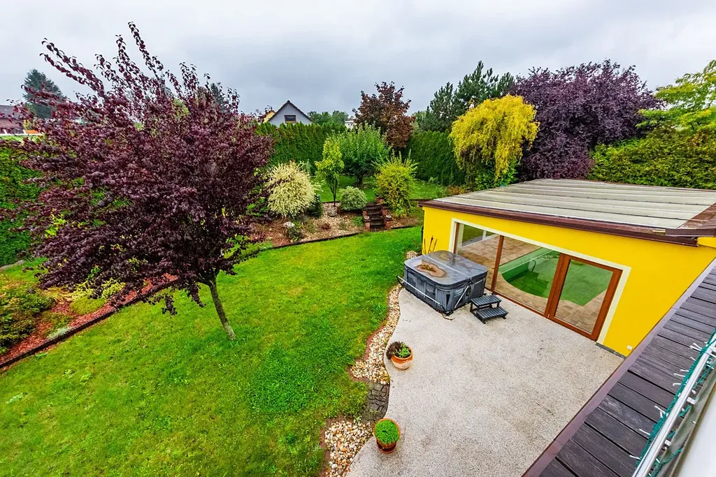 Dům sestává - v 1. nadzemním podlaží se nachází prostorný obývací pokoj s kuchyňským koutem, 2x pokoj pro hosty, koupelna s vanou a WC, technická místnost, prostorná chodba a samostatné WC. Z obývacího pokoje je vstup na terasu a zahradu. V 2. nadzemním podlaží se nachází dvě ložnice, pracovna, šatna, tělocvična, koupelna se sprchovým koutem, vstup na půdu a terasa s výhledem na krásně udržovanou zahradu. Podlahová plocha domu 218 m2.
