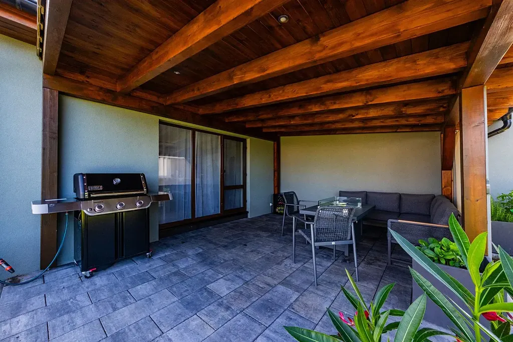 Součástí nemovitosti je venkovní krytá terasa a kompletně realizovaná zahrada se zahradním domkem, včetně zpevněných ploch a kvalitního oplocení, výměra zahrady 416 m² poskytuje soukromí, která nabízí ideální podmínky pro relaxaci, zahradničení či pořádání rodinných oslav.
