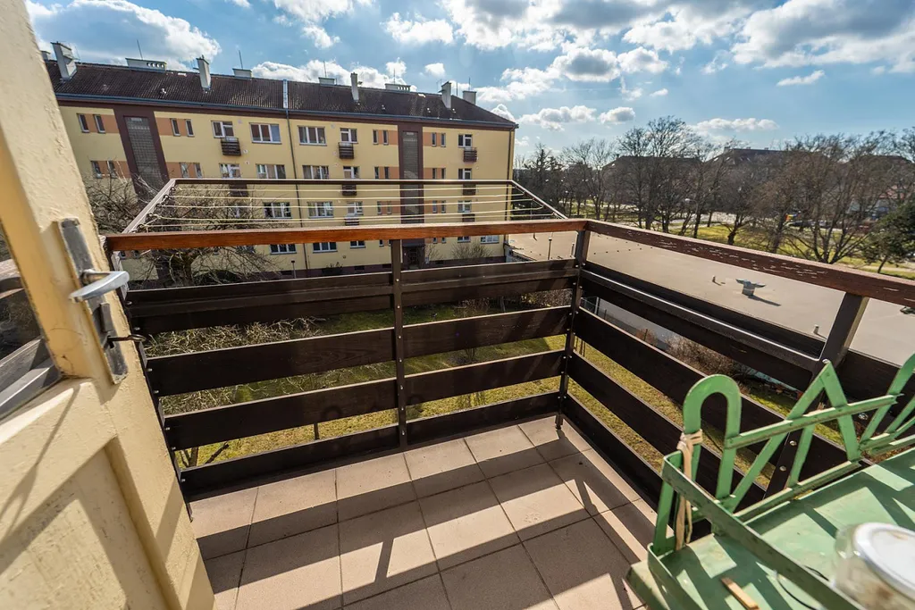 Dispozice je velmi praktická - tři samostatné pokoje, samostatná kuchyně se spíží, dále komora, koupelna a oddělené WC. Příjemným bonusem jsou dva balkony větší přístupný z obývacího pokoje a menší z kuchyně.