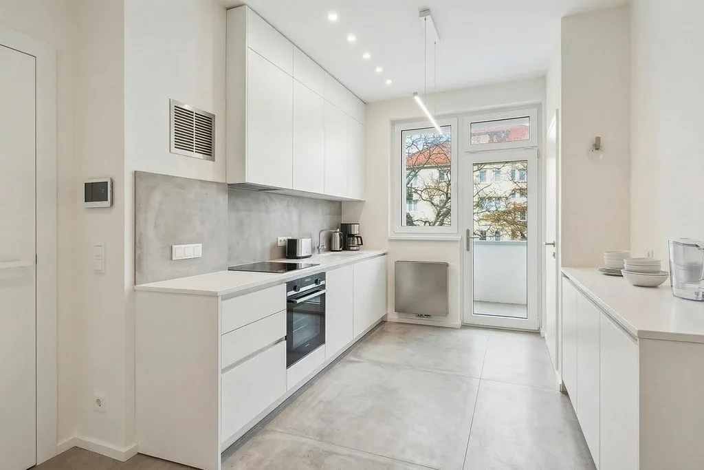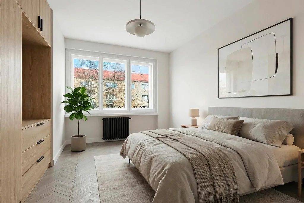 Jednou z věcí, která mě na bytě zaujala nejvíc, je příjemný klid a množství světla. Obývací pokoj a jeden z pokojů jsou orientované na jih do zeleného vnitrobloku se společnou zahradou, takže místo ruchu města tu máte výhled do zeleně. Kuchyň a ložnice směřují na sever, což pomáhá udržet v bytě příjemné klima i během teplých letních dnů.