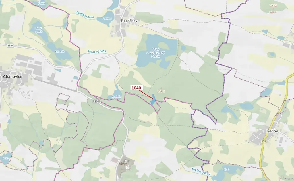 Lesní pozemek o výměře 6 519 m2, parcelní číslo 1040, podíl 1/1, katastrální území Bezděkov u Kasejovic, obec Hradiště, obec s rozšířenou působností Nepomuk, okres Plzeň-jih, Plzeňský kraj. Po těžbě.