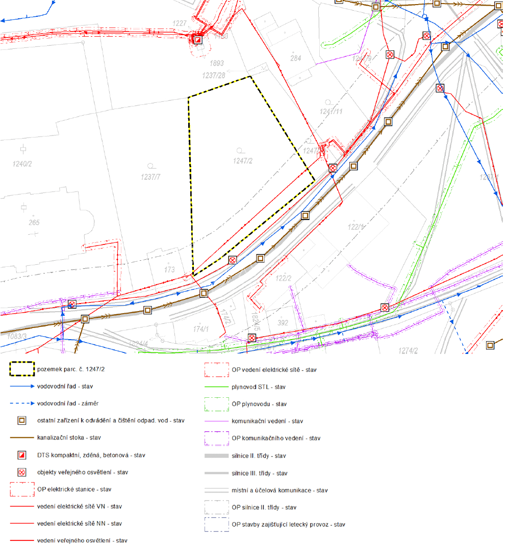 Inženýrské sítě vedou vedle pozemku. Jedná se o elektrické vedení, vodovod i spádovou kanalizaci. V obci se také nachází plynovod, avšak prozatím nevede přímo v ulici procházející vedle pozemku.